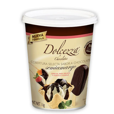 Cobertura sabor Semi amargo Bote 1 KG Ideal para Helados, Fresas, Chocobanana y demás postres. No requiere de temperado, su manipulación puede se...